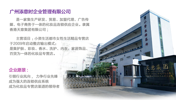廣州添意時(shí)企業(yè)管理有限公司,2009年落戶于廣州,成立于2009年11月23日,主要負(fù)責(zé)天意集團(tuán)旗下的小資生活、小資麗人、coobegirl等品牌在華的推廣。公司根據(jù)中國市場的特征和需求,創(chuàng)造性推出了整店輸出連鎖經(jīng)營財(cái)富模式,樣版市場復(fù)制模式,使之成為名副其實(shí)的女性生活精品第一品牌!